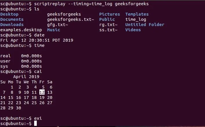 Depois de digitar todos os comandos, e sair do script com "exit", é possível tocar o que foi gravado com scriptreplay.