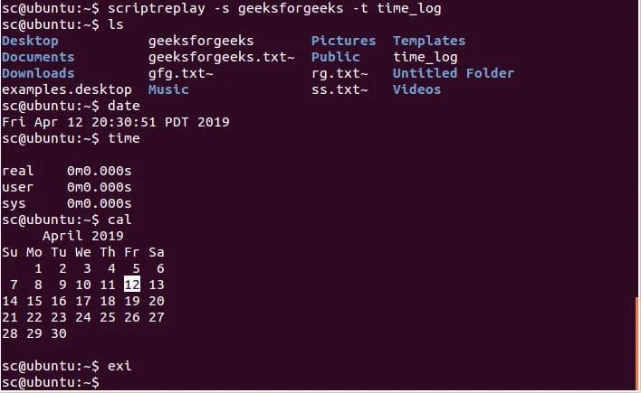 Depois de digitar todos os comandos, e sair do script com "exit", é possível tocar o que foi gravado com scriptreplay.